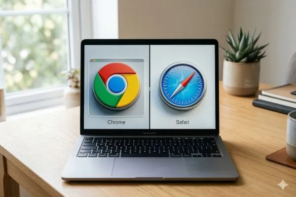Safari și Chrome pe macOS comparate din perspectiva ecosistemului, intercompatibilității și performanței — cu date Statcounter și benchmark Speedometer 3.1.