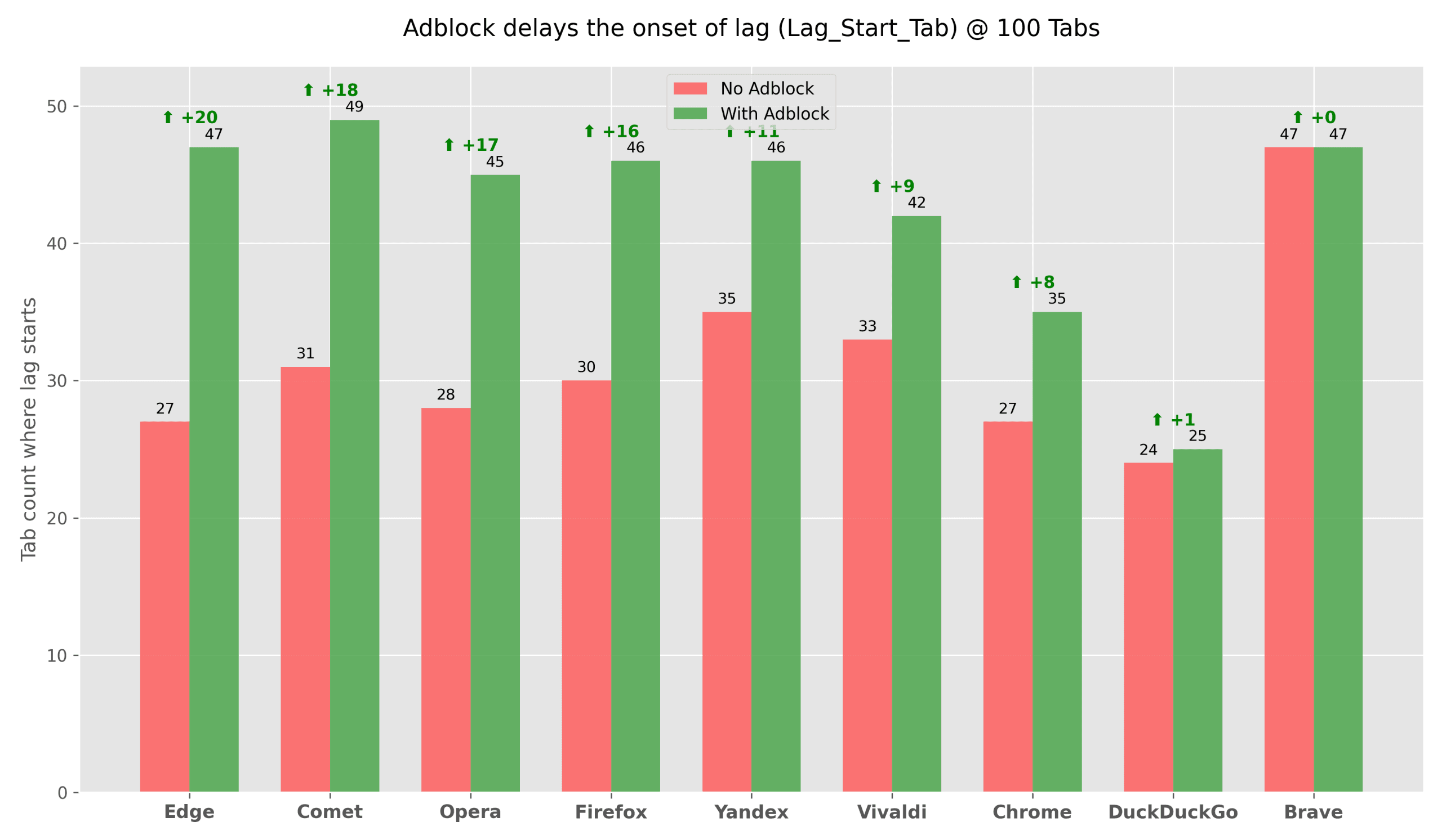 There are notable exceptions: Brave and DuckDuckGo remain almost neutral, with the adblocker having no visible impact on when lag appears.
