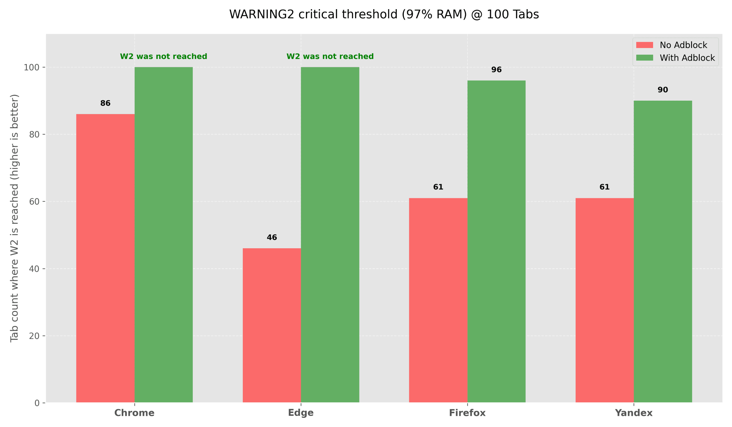- Edge: without adblock it hits the limit at 46 tabs → with adblock it no longer reaches the limit within 100 tabs